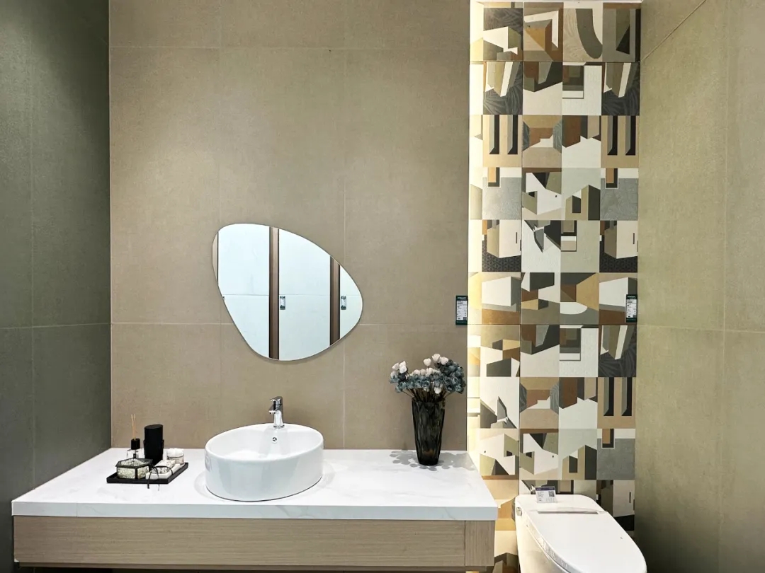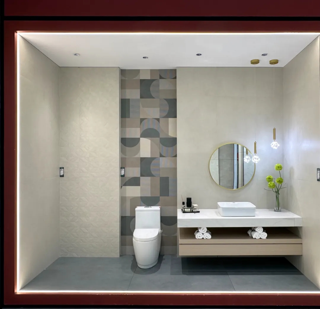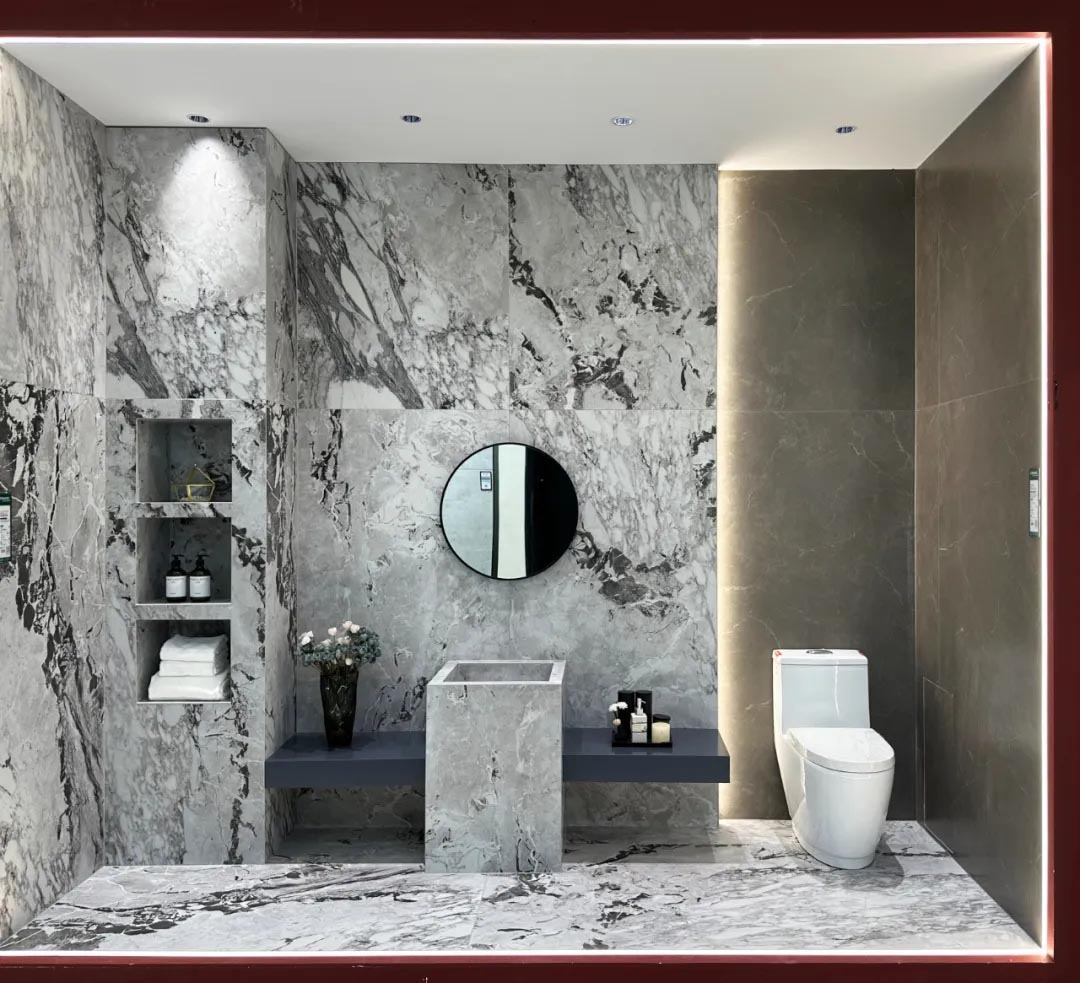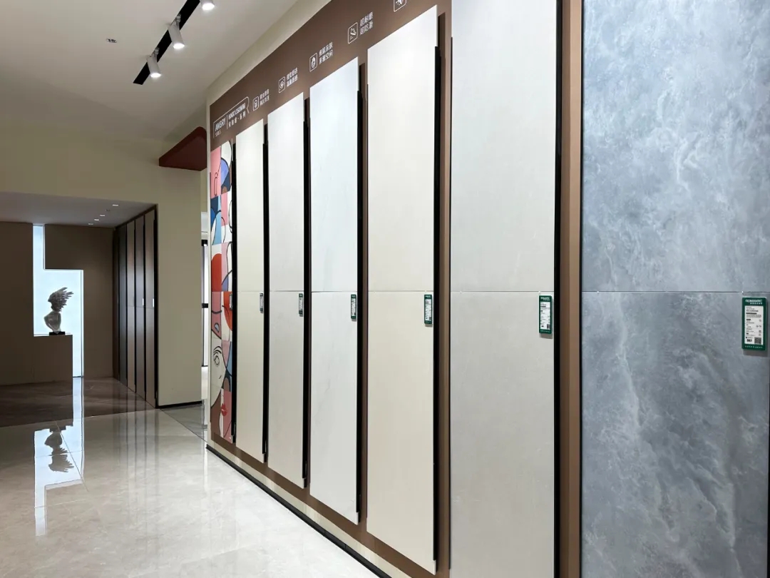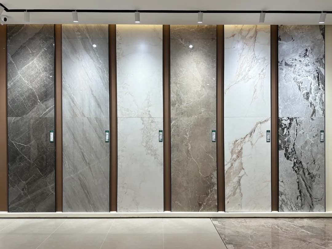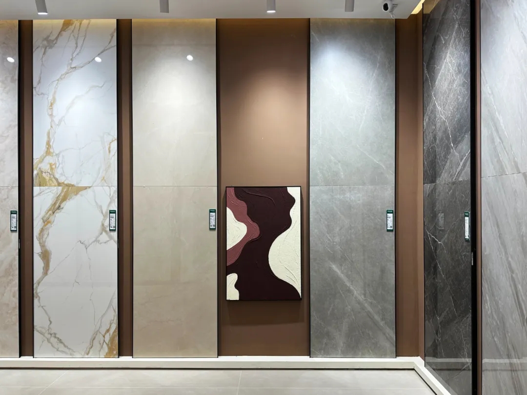 不同規(guī)格產(chǎn)品選材區(qū)穿插在各空間展示區(qū)中,產(chǎn)品按品類集中分區(qū)的布局增加產(chǎn)品系列化與產(chǎn)品整體飽滿感,所展示的產(chǎn)品皆為時(shí)下流行的大規(guī)格產(chǎn)品,讓空間與產(chǎn)品的層次性得到充分展現(xiàn)。